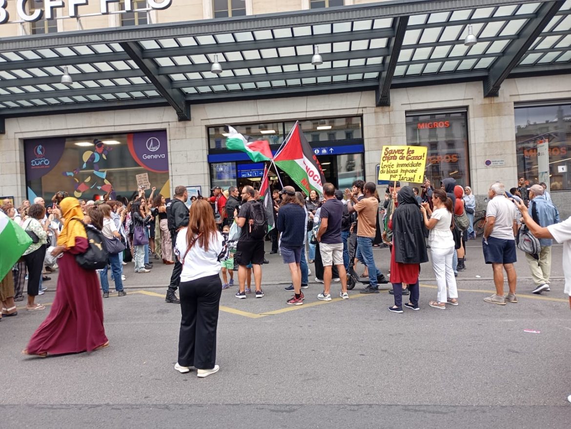 Cidadãos de diversas nacionalidades manifestaram-se ao princípio desta noite no principal terminal rodoviário de Genebra, na Suiça, exigindo o fim da guerra na Palestina.